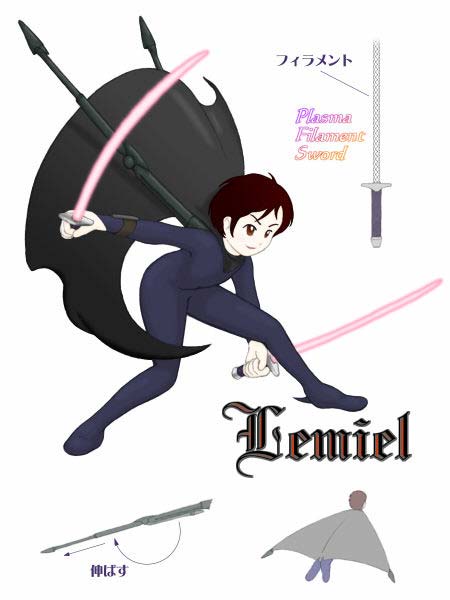 身長160cm サイボーグ義賊 武器: プラズマ・フィラメント・ソード 普段は腕のホルダーに取り付けられており、グリップに 収納されたプラズマ制御用のフィラメントが伸びて剣となる。 (ほとんどライトセーバー) フィラメントは柔軟で磁気力により剛化できるが、エネルギー 消費が大きいためエネルギーを手から供給しなくてはならない。 (電磁結合でエネルギーを供給するため、レミエルは掌でのみ 高周波誘導拳が使用可能) とりあえず滑空します。(空気が濃くて、重力の弱いところのみ) |
