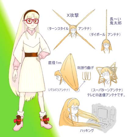 | ・身長160cm ハッカーアンドロイド。チップ脳ではなく、 宝石のような耐電磁干渉人工脳(理創機)が入っています。 ・センサを持った髪が自在に変形し、伝送路や内視鏡になります。 (アンテナ例を図示)パラボラ:導体が波長より充分に短い間隔で 並んでいれば、電波を反射できます。 ・目から光通信。めがねは、高エネルギー防護用。 ・ハッキングを受けても、超並列アイソレータにより 即座に異常を検出し、モニタリングして賢くなります。 ・潔癖症。(汚れるとメンテナンスに時間がかかる) |