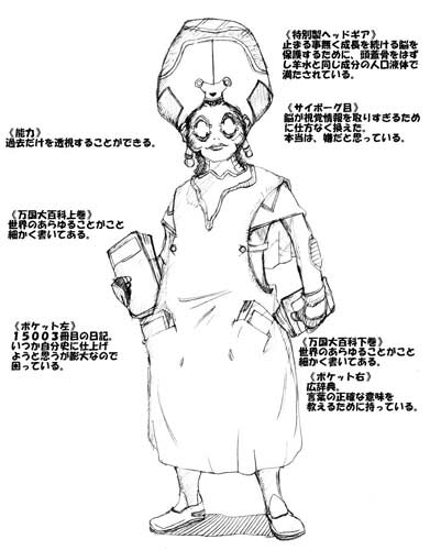 名前:OMNISCIENCE【オムニシャンス】 止まる事無く成長し続ける脳。 通常の人類の脳の処理能力をはるかに上回る。 「万国大百科」という辞典を持ち、すべての事柄に精通している。 ノヴァ教授が人類史上最高の脳と賞賛する。彼(彼女?) との 出会いによって、ノヴァ教授は業の克服を目指そうとする。 それは、脳がチップであることへのコンプレックスを抱かせたため。 また、機械化文明を全否定し、歴史と文学をこよなく愛し、 「サイボーグ否定論」を著書。SFの世界におけるアンチテーゼとしての キャラクター。年齢は、自然長寿で1000年くらい生きている。 好きな言葉「把握」「結論」「真実」「結果」など。 口癖「答えを探せ」 好きな作家「星新一」 ムバディとは、異なった強さのイメージ。もし戦うなら、 格闘技や銃器を使わない。言葉とその卓越した話術で 精神的なダメージを受ける。言霊のような技術を持っている。 |