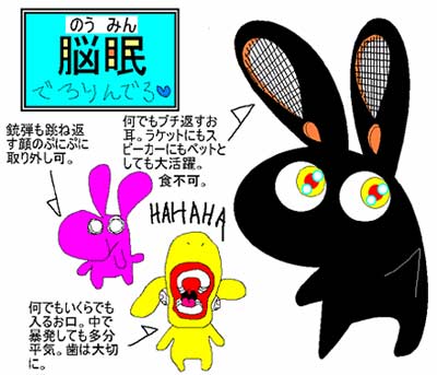 | 悪い夢を食べてくれる獏(バク)をモデルに 製造された緊急睡眠装置です。 5分の接続(脳眠のお口に頭を入れて下さい)で約8時間の十分な 睡眠がとれます。脳眠は知能を持っています。ですから、 あまりひどい扱いをしますと、反撃されたり、悪夢を見るように なるかもしれません。御注意下さい。また、起きた出来事を夢の中で 分析、処理し、脳に記憶を強く定着させたり、ハッとした ひらめき(新しい情報)を生み出したりと、 考えがまとまらない時にもお役立ち。 ゆきと先生へ、これからもガリーと一緒にがんばって下さい! 愛のあるガリーが大好きです。 |