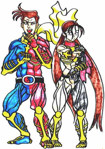 | チームコリア 朝鮮民族の末裔、テコンドーの技をもって自分達の存在を示し、 宇宙に散らばる同胞達に集合統一を呼びかけ祖国を復興することを 目指して戦っている。 チャン(左) 普段は静かでおとなしいが、変身ベルトにより変身し強化スーツを まとうことにより狂暴な性格をしたキックの鬼と化す。 そのパワーを生かした力任せの戦法を得意とする。 メイ(右) 冷静沈着を旨とし、変身時のチャンに助言を与えるなどして、彼の サポートをする。又自らも変身して戦うこともあり、彼女は身軽さと 技に優れており素早さ重視の戦法を得意とする。 強化スーツ 特殊素材により、人体の筋肉と骨格を模して作られている。身体各部に 取り付けられたプラグを介し装着者の意のままに動かすことができる。 大変な柔軟さと強度を併せ持ち、装着者の力を何倍にも上げるとともに 強力な鎧にもなる。 |