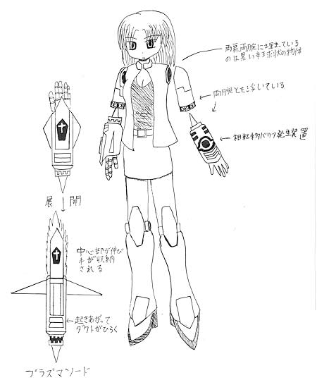 火星生まれの218歳。 200歳あたりまではLADDERでFabulous Agent (伝説のエージェント)と呼ばれるほどの敏腕エージェント として過ごしていた(FA・ファという名前はそこからとった)。 火星の王がLADDERによって暗殺されたのをきっかけに退職した。 それからはレヴァイアサンの戦闘解放地区で賞金稼ぎをしている。 ガリィ達が来たときは帰省しており、遭遇しなかった。 普段、頭の中では常人の理解の及ばないことを考えているが、 回りの一般人が見るとぼーっとしているように見える上に 定職にも就かないので、Free Agentのファ(無職のファ) と皮肉られている。 武装は右手のプラズマソードと左腕の相転移バリア。 それと自由に浮遊出来る両腕に内蔵されたビームガン。 戦闘スタイルはプラズマソードを使った剣術。 優れた空間認識力を活用した両腕のビームによる オールレンジ攻撃とカポエラによるコンビネーション攻撃。 ちなみに腕が浮いている原理は本人にも分からないらしい。 |