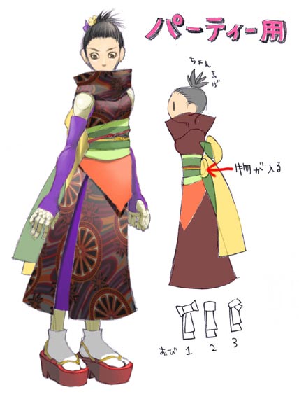 | もっとヒラヒラでフリフリで乙女ちっくな物も考えていましたが、 ウエディングドレスとカブったので 和服もどきの方にしました。 パーティーなのに物が食べづらいのが特徴です。(うーん;) こんなタイトな服で暴れまくってほしいものです。 |