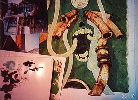 色味の違うパイプの下地の色をつけ始めました。この時点では、パイプの色を青くしようかどうか迷っています。