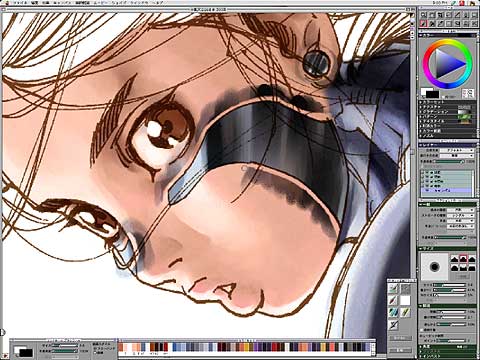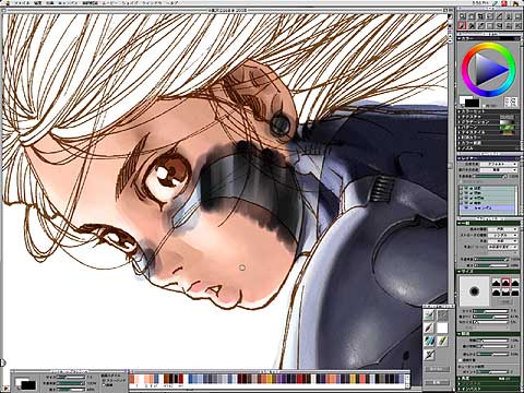 キャンパスを選択し、水彩ブラシで頬のメタル部分を描く。