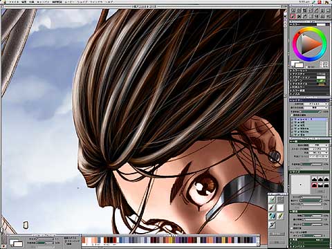 いよいよ最終工程にはいる。ファイルをPainterで開き、線画レイヤーの上に新規レイヤーを作製。チョーク(細)、「塗り潰し+フラット」のブラシを使い白に近いオレンジで髪の毛のハイライトを入れていく。細くした消しゴムブラシで整える。