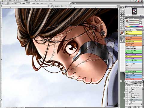 髪の毛が顔に落とす影を表現するため、ペンツールで選択範囲を作り、顔の影の色をスポイトツールで採集してエアブラシツールで塗る。
